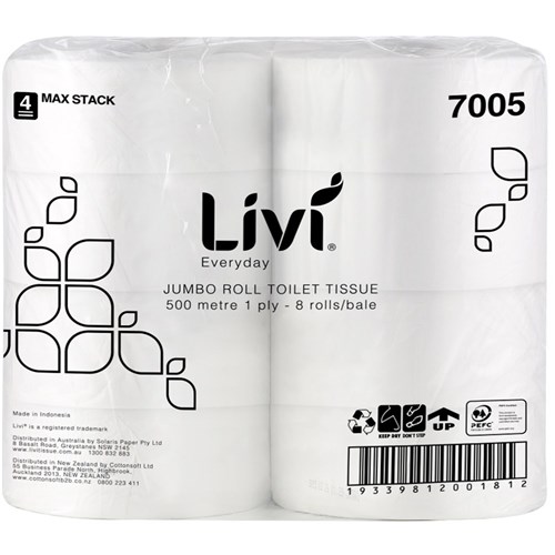 Livi Everyday Toilet Paper Jumbo Roll 1 Ply 500m Pack Of 8