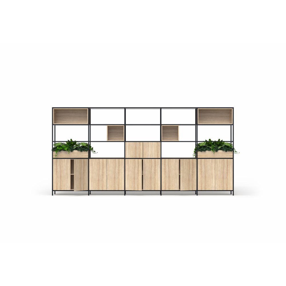 • OLG Rhodes Modular Shelving 5 Bay 4200W x 455D x 2000mmH New Oak Ravine Black Frame